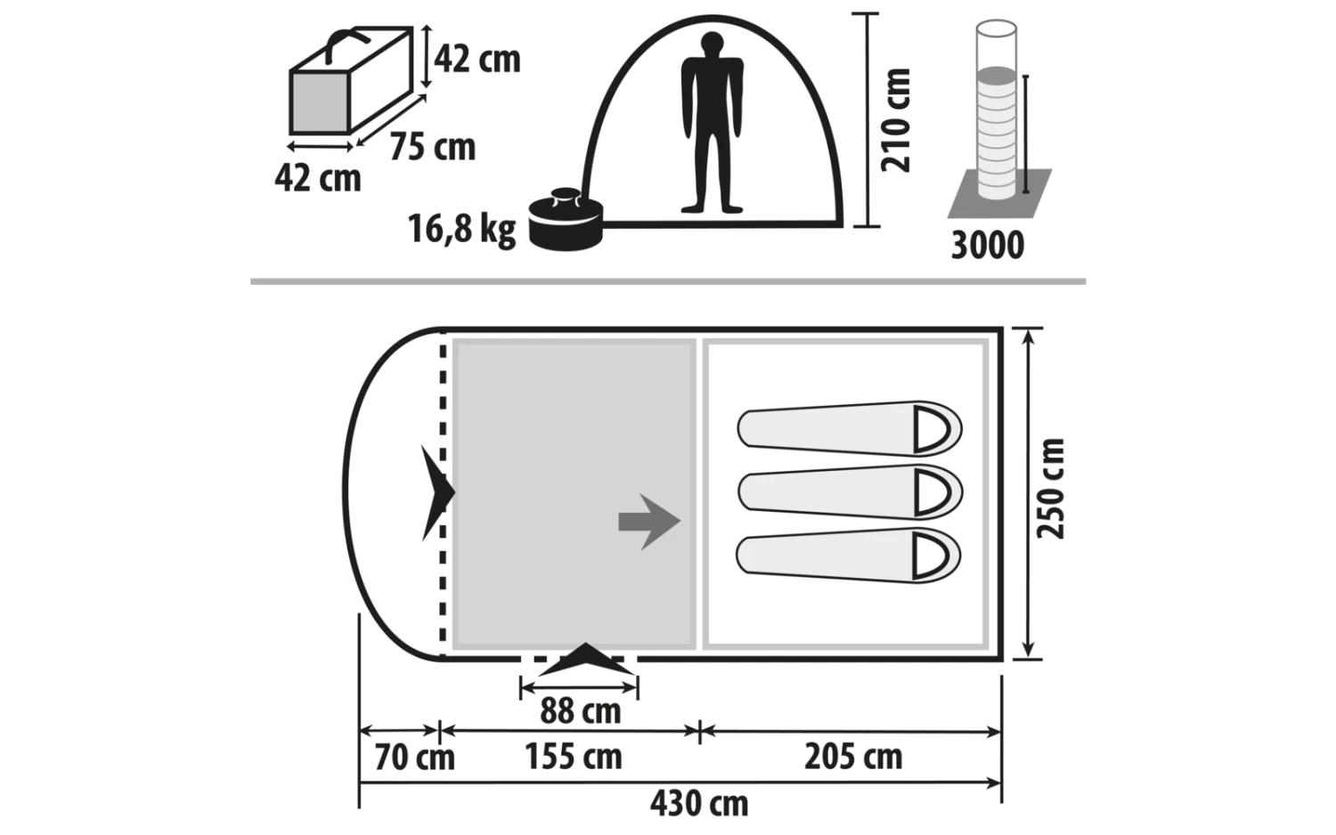 | Lieferumfang | Außenzelt, Schlafkabine, Gestänge, Luftpumpe, Abspannmaterial und Packtasche (100 % Polyester) |