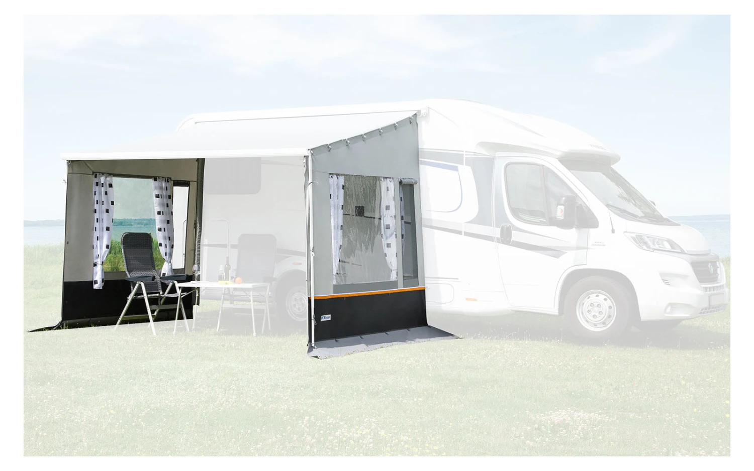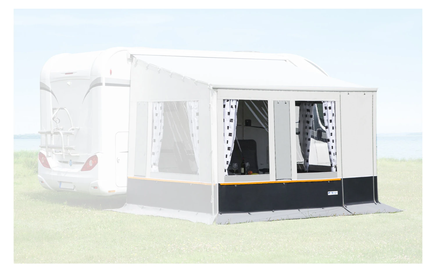 - zwei Klarfolienfenster, ein Moskitogazefenster, hochrollbare Eingangstür