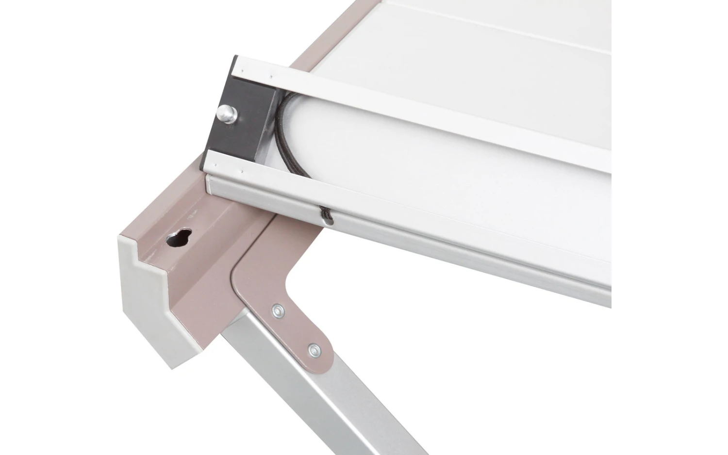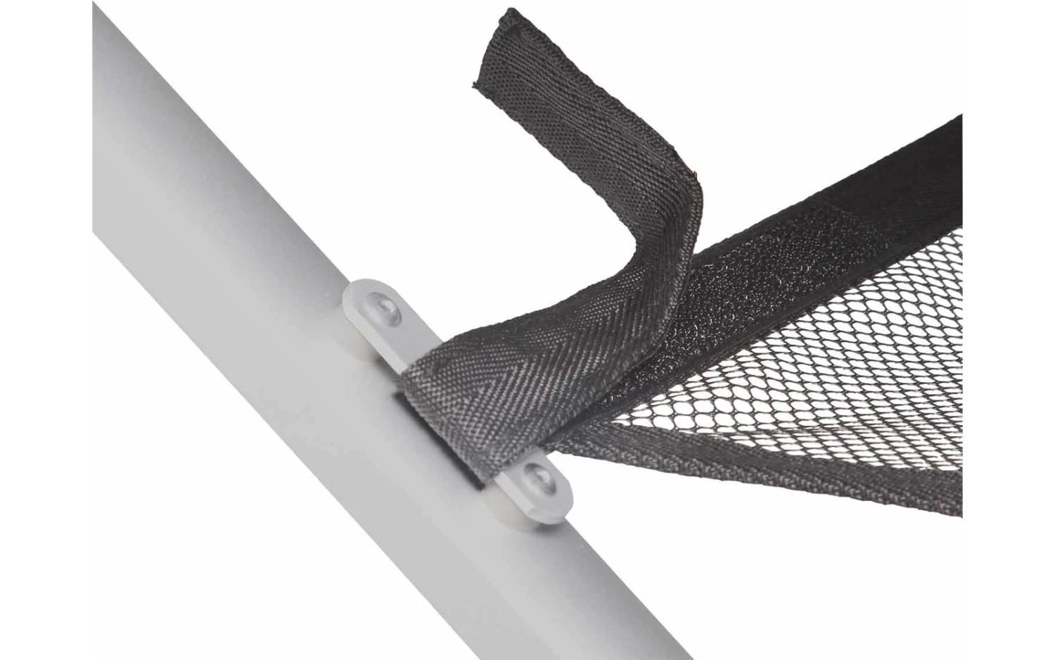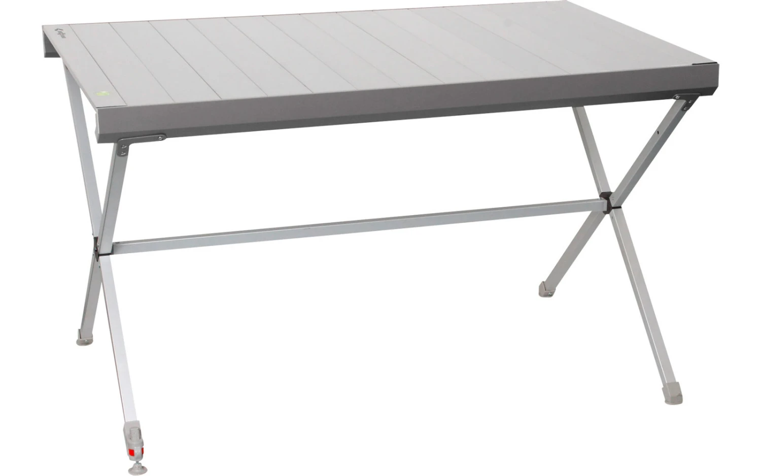 Aluminiumtisch Axia mit Rollplatte und speziellem, einfach zu montierendem Klapprahmen. Rolltischplatte mit silber eloxierten Lamellen (Gapless-System). Sehr stabiler Rahmen aus Aluminium-Vierkantrohren und zentraler Stabilisierungsstange. Mit praktischer Netzablage und Transporttasche (100 % Polyester) mit 2 separaten Fächern.