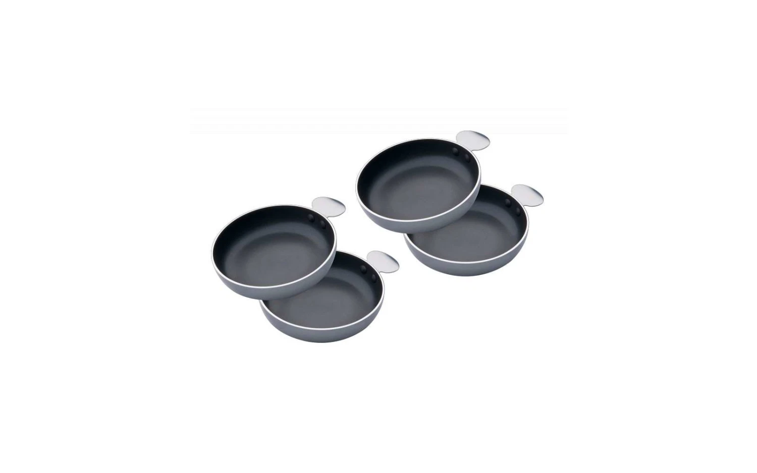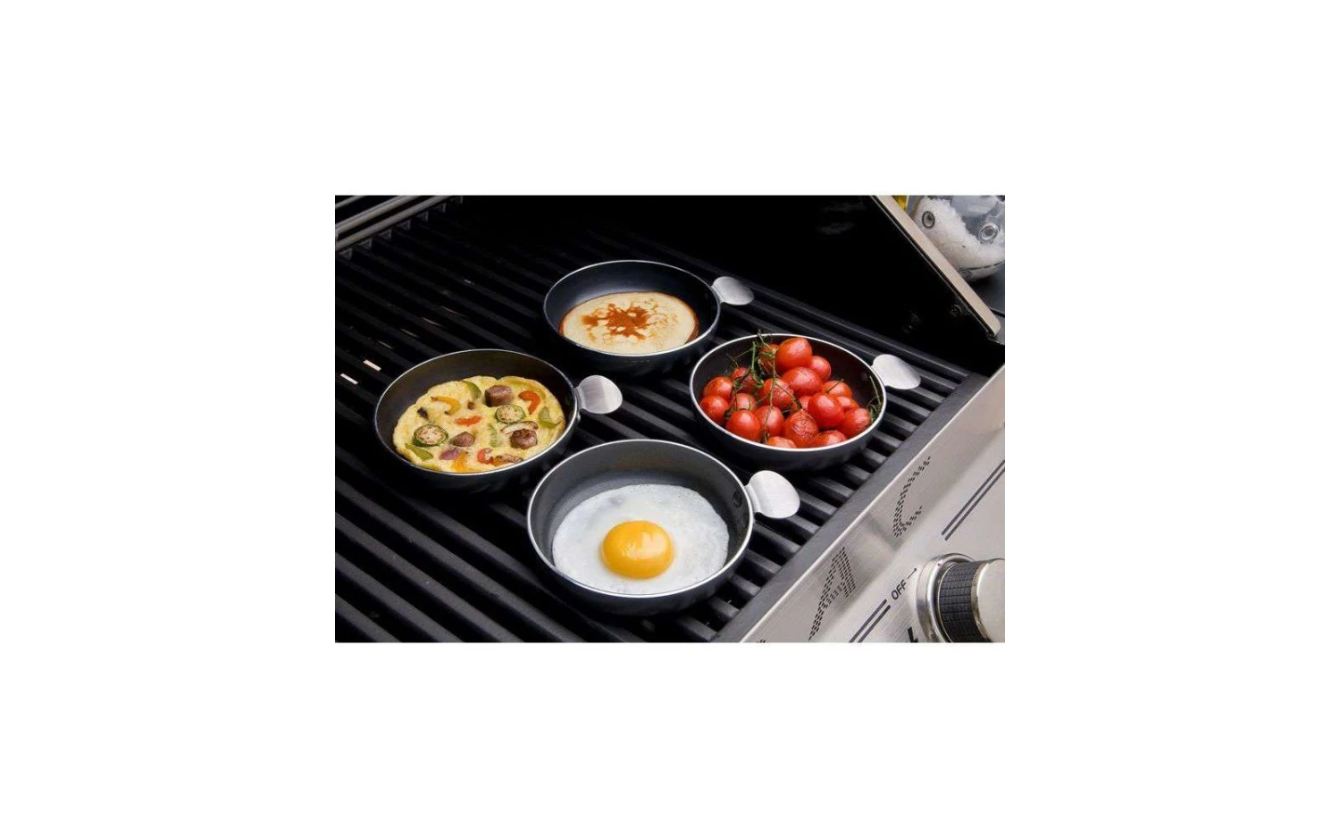 Kleines Pfannen-Set bestehend aus 4 einzelne, keramikbeschichtete Aluminiumpfannen. Die Pfannen sind leicht und einfach zu reinigen und eignen sich für Grills, kleine Gaskochplatten und Campingkocher.