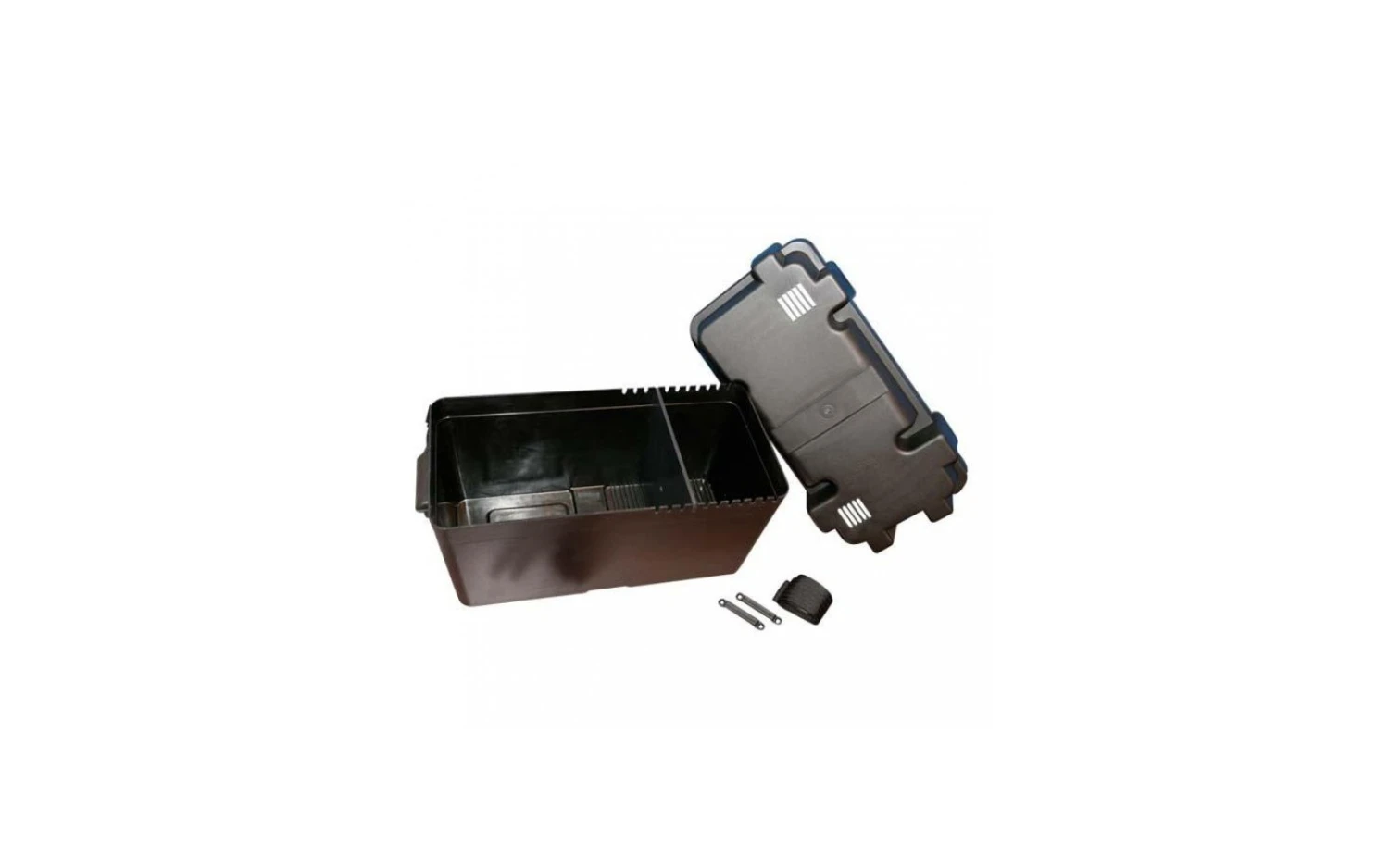 Verschluss durch Gurt. Versetzbare Einteilung im Innenraum, damit auch kleinere Batterien optimalen Halt finden.