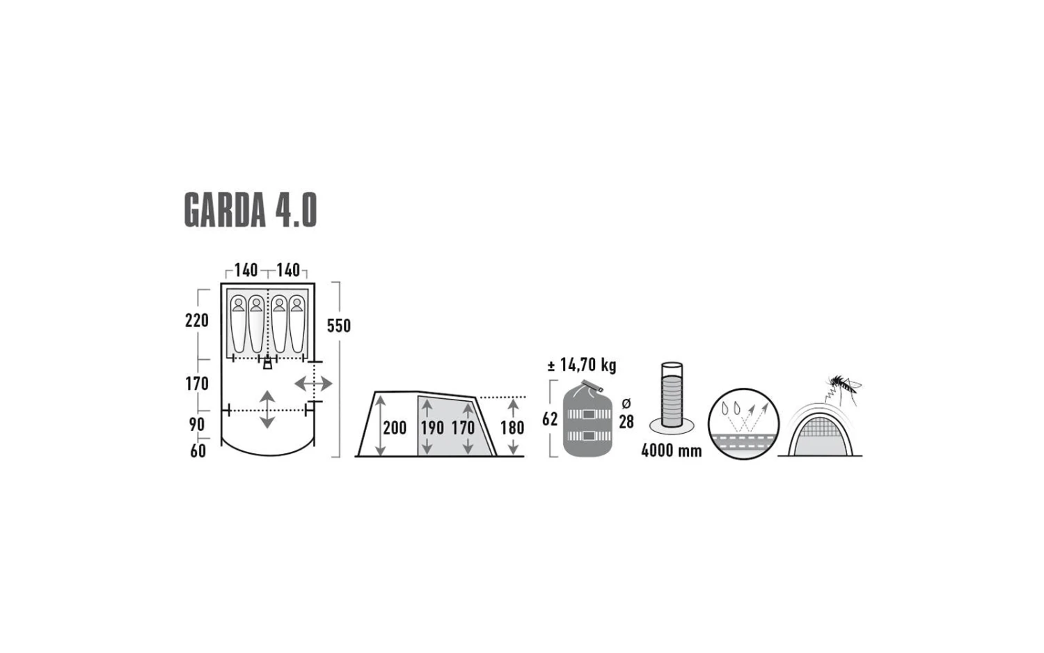 | Lieferumfang | Zelthaut, Gestänge, Abspannmaterial, Innenzelt, Packsack |