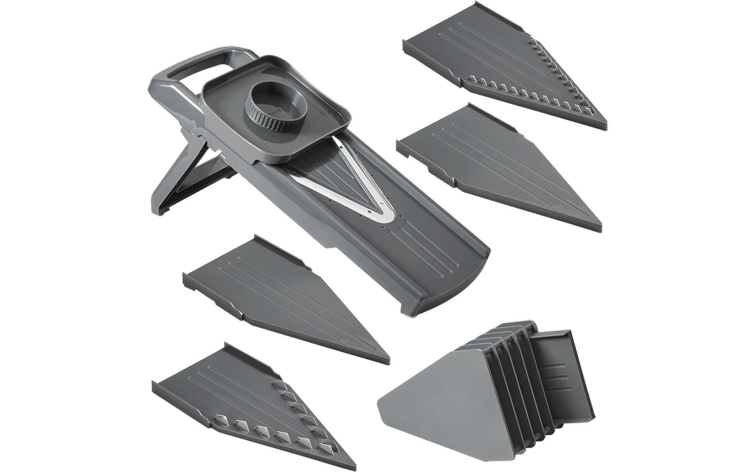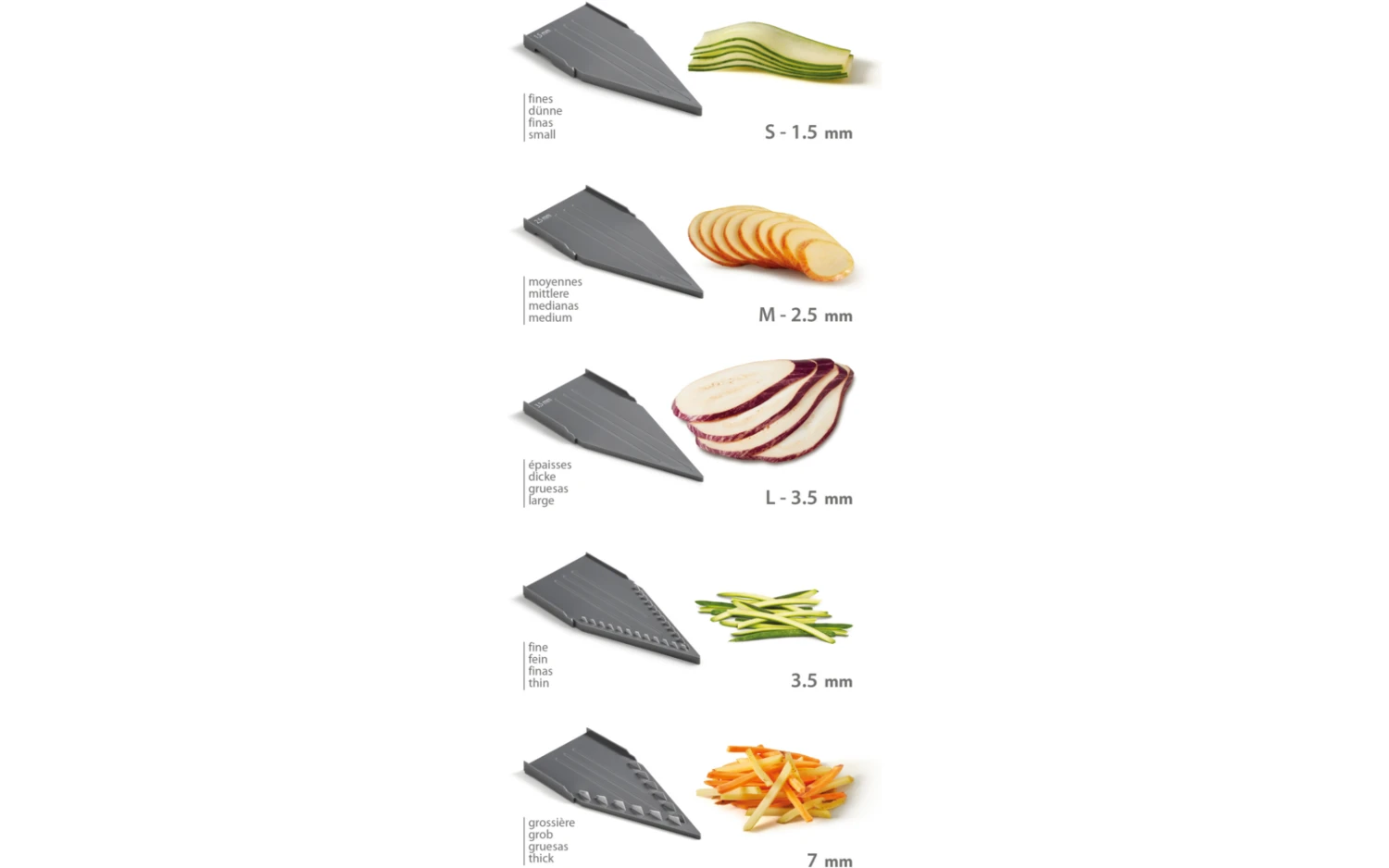 - Fünf auswechselbare Klingen für verschiedene Schnittstärken und -formen