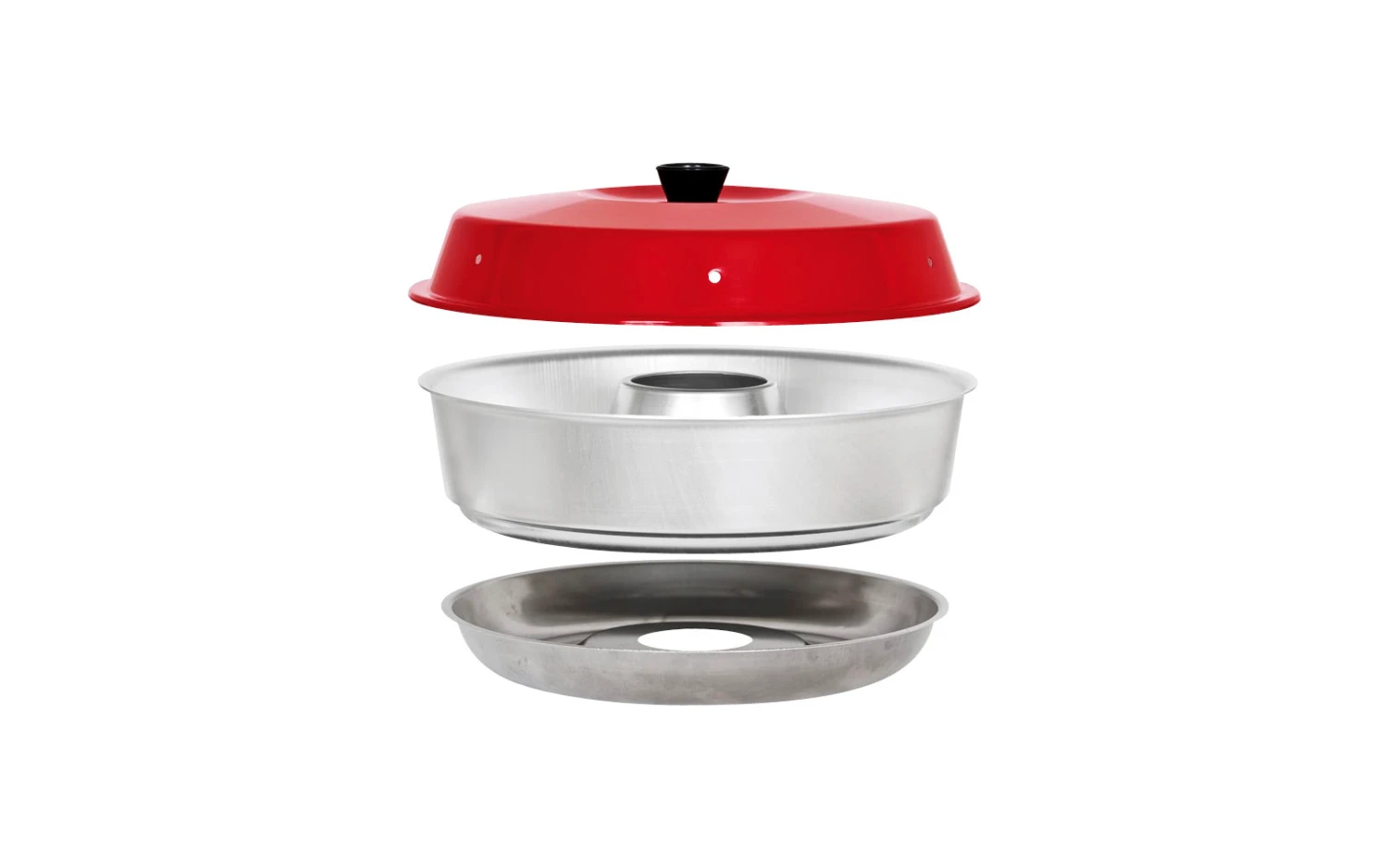 Der OMNIA Camping-Backofen besteht aus drei Teilen. Eine Form aus Aluminium, die wie eine runde Kuchenform mit einem Loch in der Mitte aussieht. Diese füllt man etwa bis zur Hälfte mit den Zutaten bzw. mit dem Teig. Zur Form gehört ein speziell geformtes Untergestell aus Stahl, das auch ein Loch in der Mitte hat. Der rote Deckel hat kleine Ventilationslöcher und eine ausreichende Höhe, damit Kuchen und Brot aufgehen können. Der OMNIA wird mit dem Loch direkt über die Flamme (oder in die Mitte der Herdplatte) platziert. Dadurch steigt die Hitze von der Flamme durch die Konstruktion und erzeugt Oberhitze im Ofen.