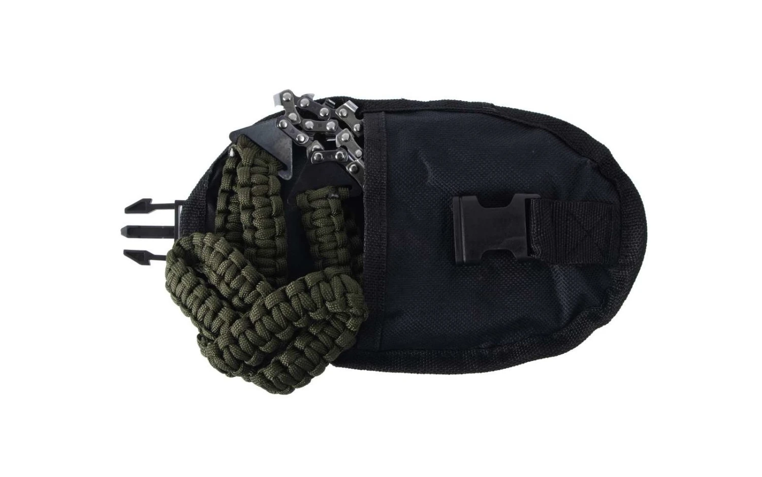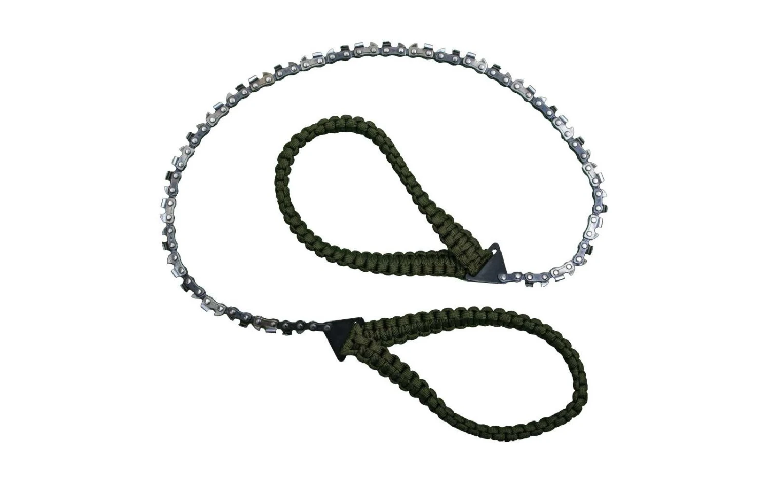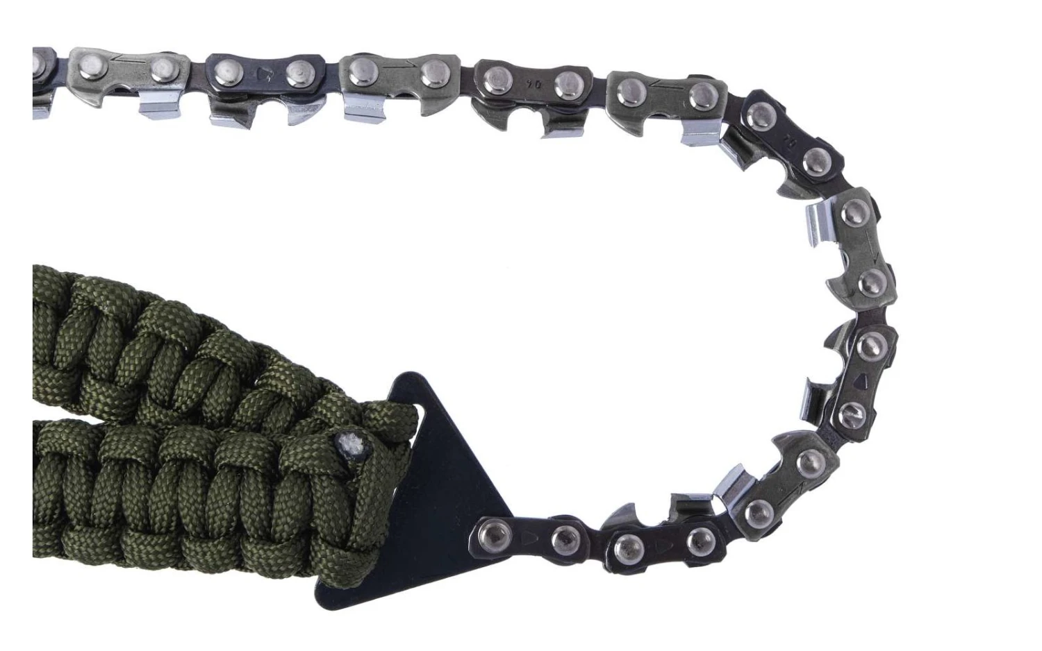 Die Paracord-Handschlaufen bieten sicheren Halt und im Notfall insgesamt knapp 10 Meter Seil. Die Zähne können wie bei einer motorisierten Kettensäge nachgeschliffen werden.