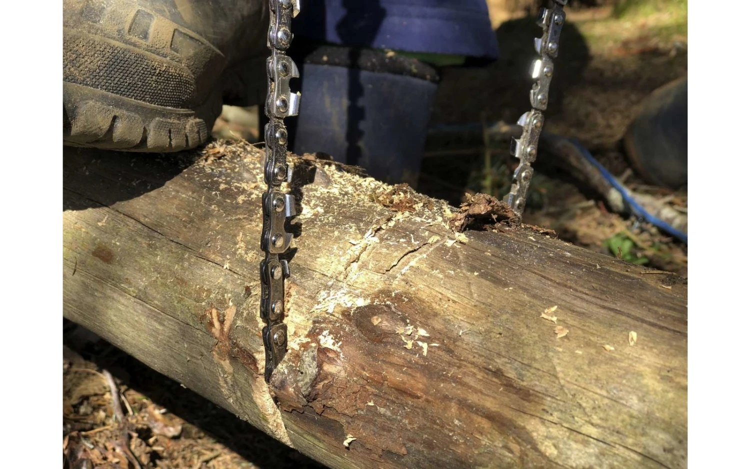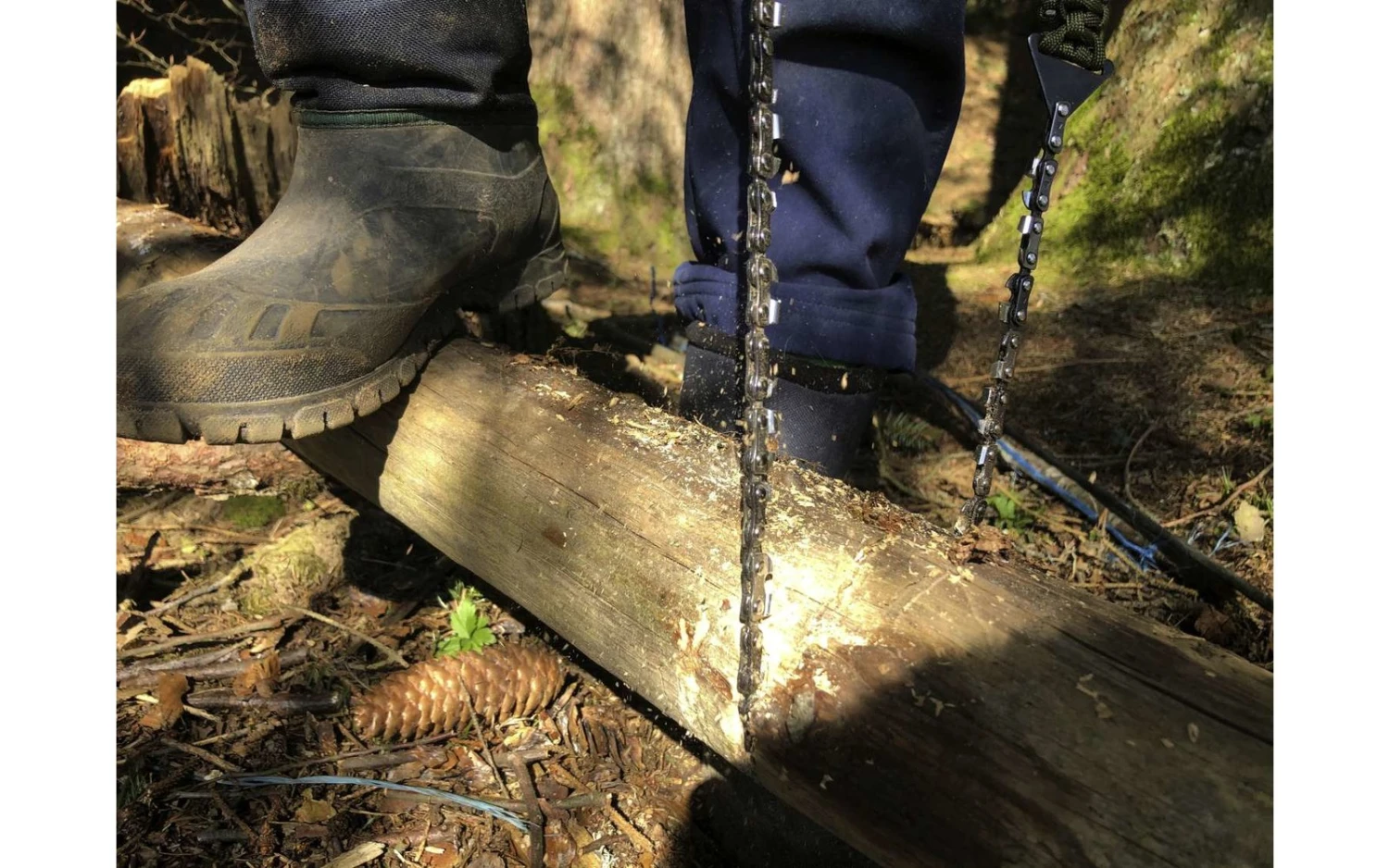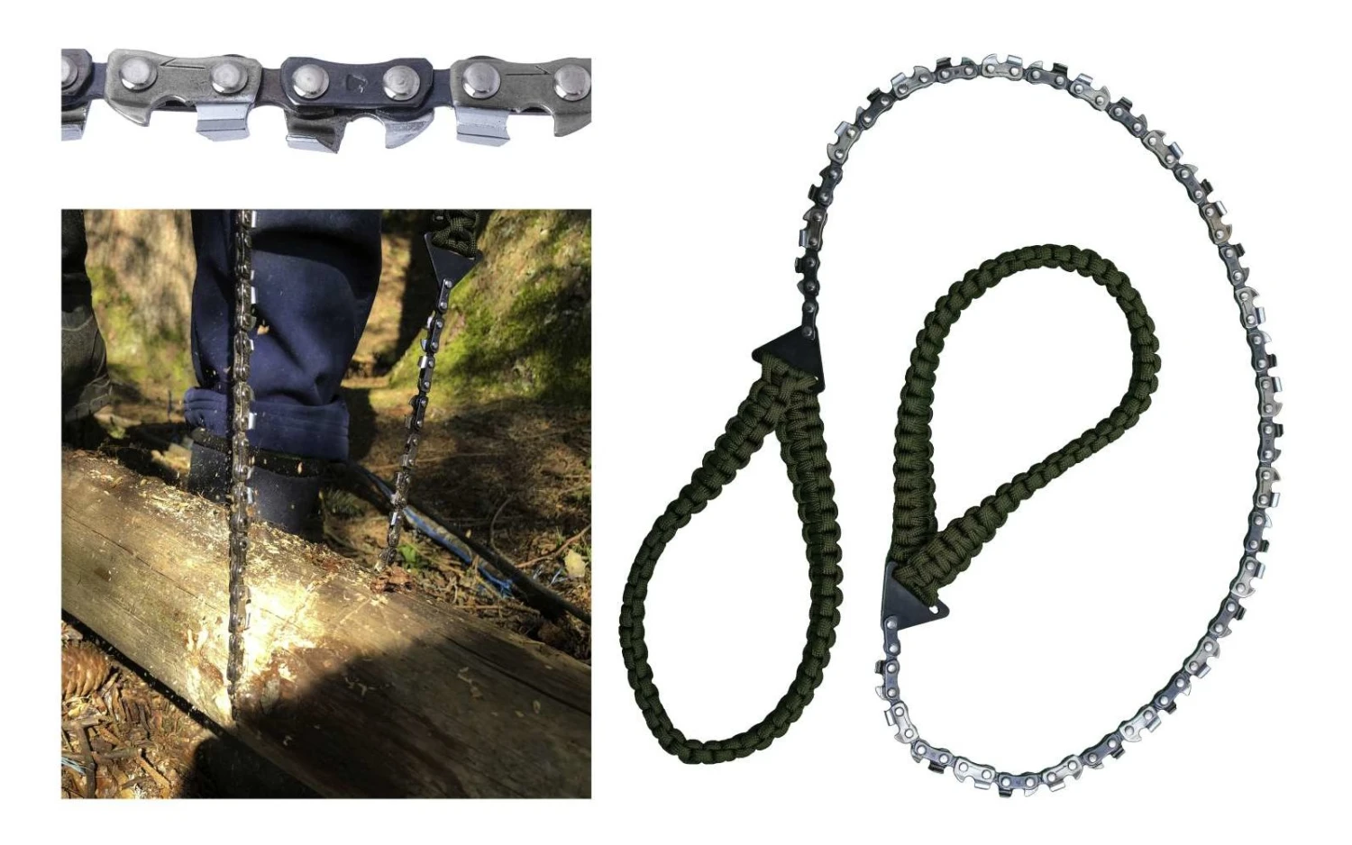 Die Paracord-Handschlaufen bieten sicheren Halt und im Notfall insgesamt knapp 10 Meter Seil. Die Zähne können wie bei einer motorisierten Kettensäge nachgeschliffen werden.