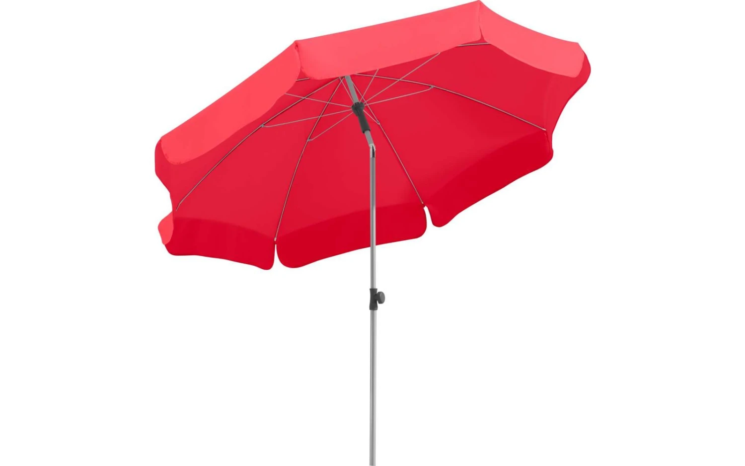 Sonnenschirm mit starken Farben, hochwertigem Material und einem UV Schutz von 50+. Bespannung: 100 % Polyester, ca. 160 g/m². Verrottungsfest, wasserabweisend imprägniert, mit Volant und Bandeinfassung. Gestell silbergrau pulverbeschichtet, alle Kunststoffteile anthrazit, großer Schieber mit Taste, Drehfeststeller, Kugeltop, Metallknicker mit Druckknopf, Stock 2-teilig Ø 22/25 mm.