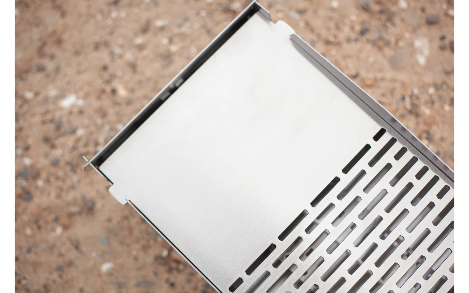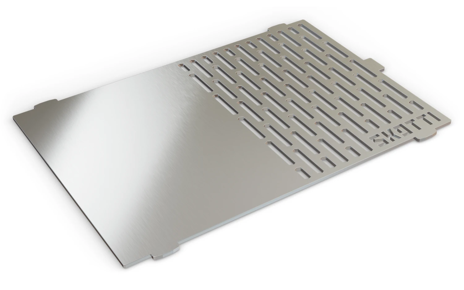 Plancha ist spanisch und heißt Eisen. Lege die SKOTTI Plancha statt des Grillrosts in Deinen SKOTTI Grill und bereite Dir dank der indirekten Hitze auf der Platte herrlich zart und saftig auch kleines Grillgut wie Garnelen, Gemüse oder Pilze zu. Oder wie wäre es mal mit einem Spiegelei vom Grill? Die SKOTTI Plancha passt für den Transport mit in die Tasche Deines SKOTTI Grills.