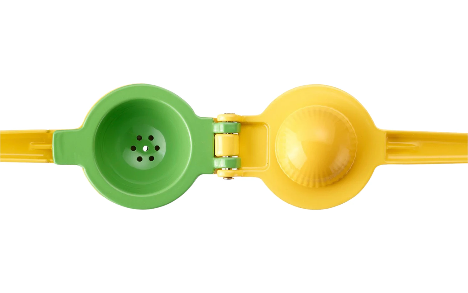 - So geht’s: die Frucht mit der angeschnittenen Hälfte nach unten in den Presskegel legen, der halbrunde Pressstempel drückt die Fruchthälfte nun mit Kraft auseinander
